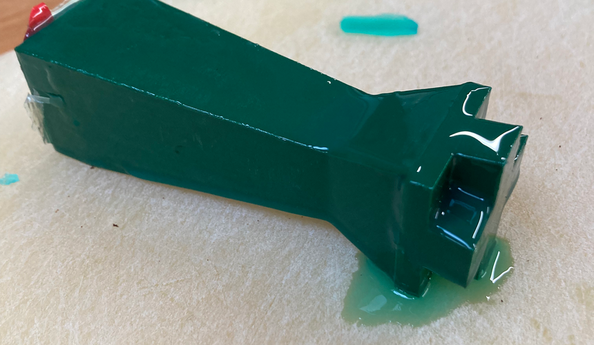 I attempted to cast my king piece as I felt it had the simplest form and my square piece had not been 3D printed yet. I taped the lid onto the bottom to ensure the silicone did not leak out of the mould and poured it in. Unfortunately, the 3D printing material inhibited the silicone from curing. I attempted coating it in liquid latex and vaseline to try and create a barrier between the plastic and the silicone, but this did not work either. While doing this I was also experimenting with painting on liquid latex to make a mould that way. Unfortunately, the 3D-printed master form also prevented the liquid latex from drying properly and so it took several days to build up the layers, thus making it wildly impractical.